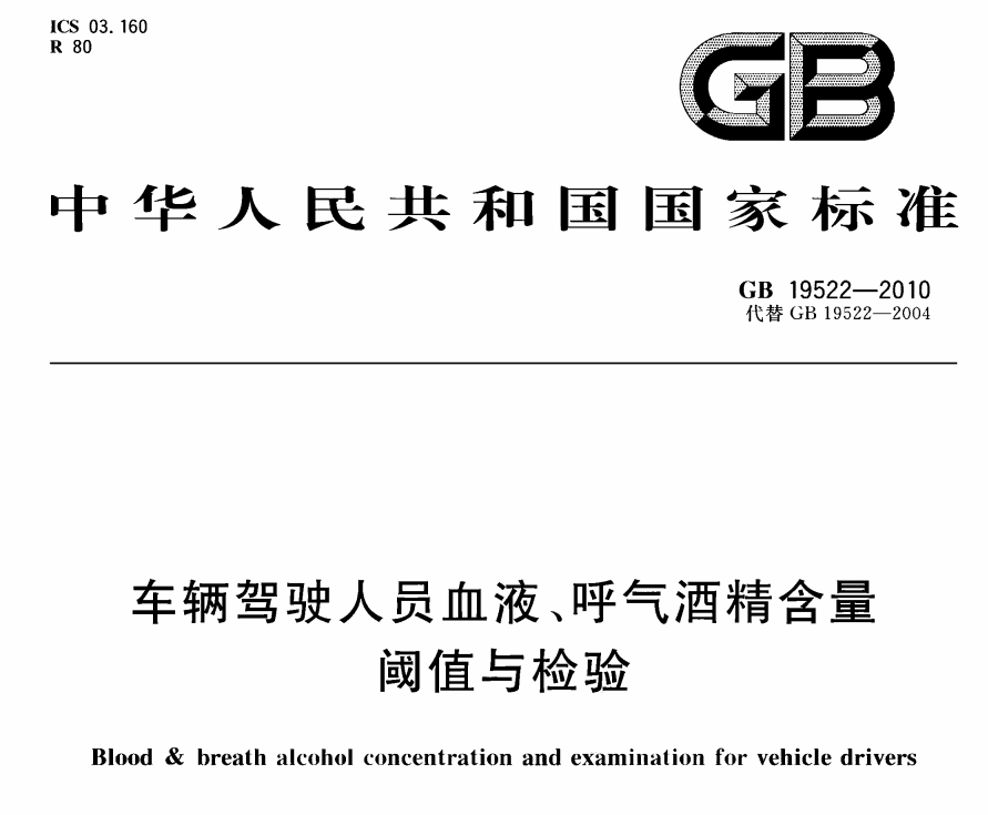 GB 19522-2010 車輛駕駛人員血液、呼氣酒精含量閾值與檢驗 中華人民共和國國家標準——車輛駕駛人員血液、呼氣酒精含量閾值與檢驗標準(由國家公安部提出,國家質(zhì)量監(jiān)... 更新日期:2020-05-09 下載包(1)